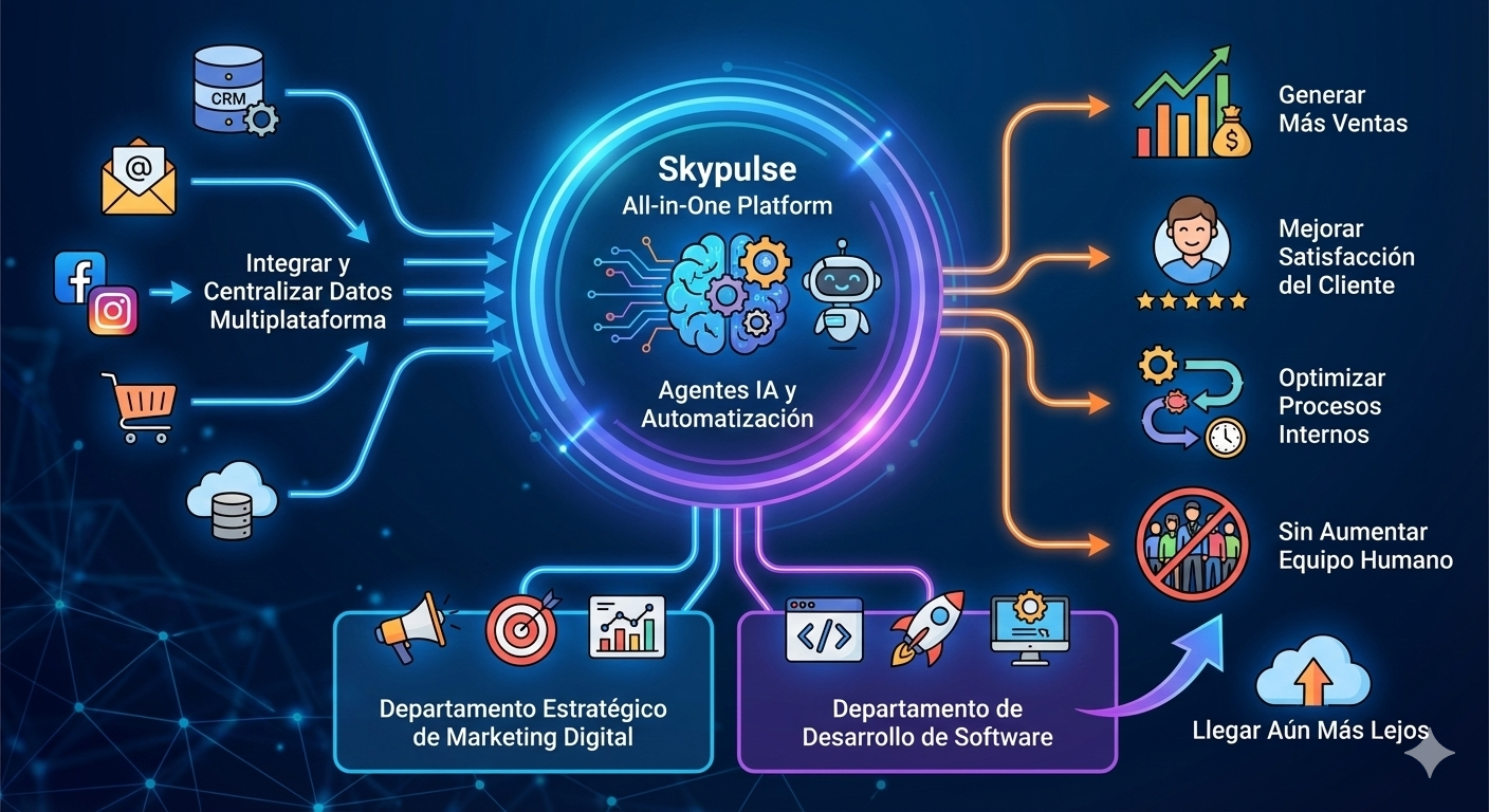 Skypulse es la plataforma all-in one que permite a las empresas y freelancers integrar, centralizar y cruzar todos sus datos multiplataforma, automatizar procesos y usar los agentes IA para generar más ventas, mejorar la satisfacción del cliente y optimizar procesos internos sin necesidad de aumentar el equipo humano.