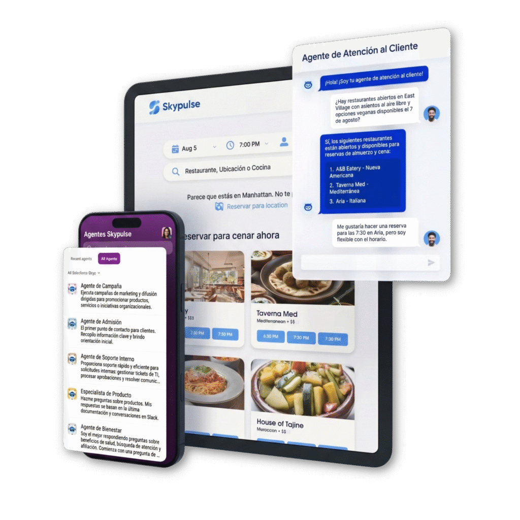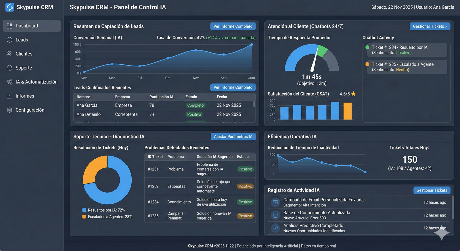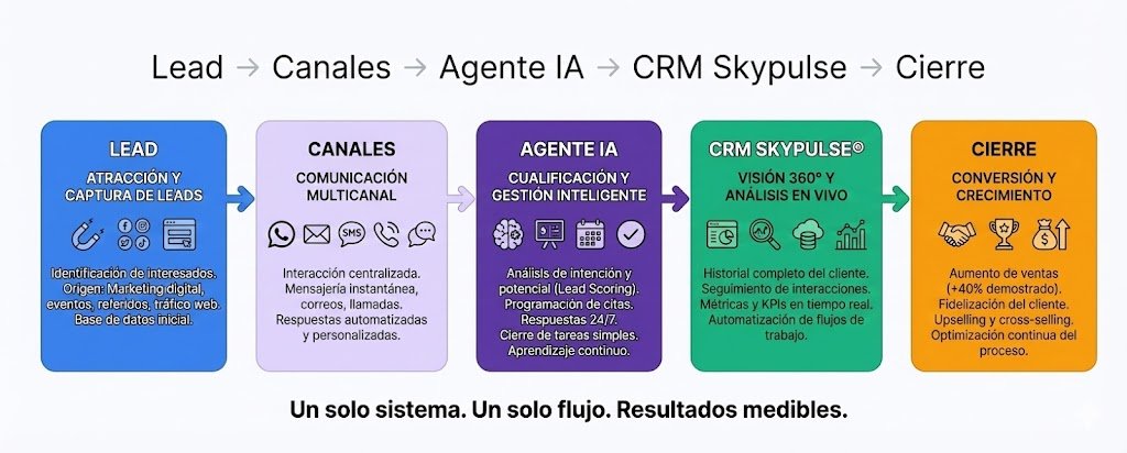 ¿Usa Salesforce? ¿HubSpot? ¿Zoho? ¿Su propio ERP? No le pedimos que cambie nada. Desarrollamos su agente IA para que hable directamente con sus sistemas vía API. O, si prefiere, puede usar nuestro CRM Skypulse, un panel unificado donde ve cada lead, cada interacción, cada venta, en tiempo real.